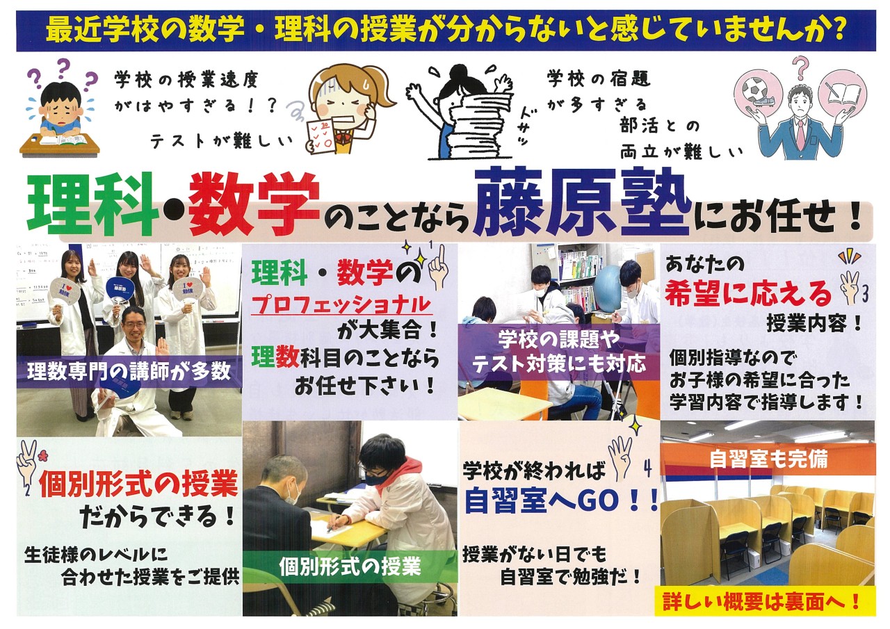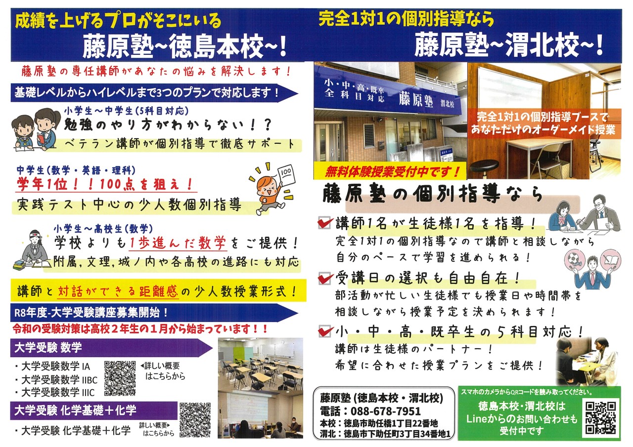 藤原塾|徳島本校•渭北校|理科•数学|個別指導|少人数授業