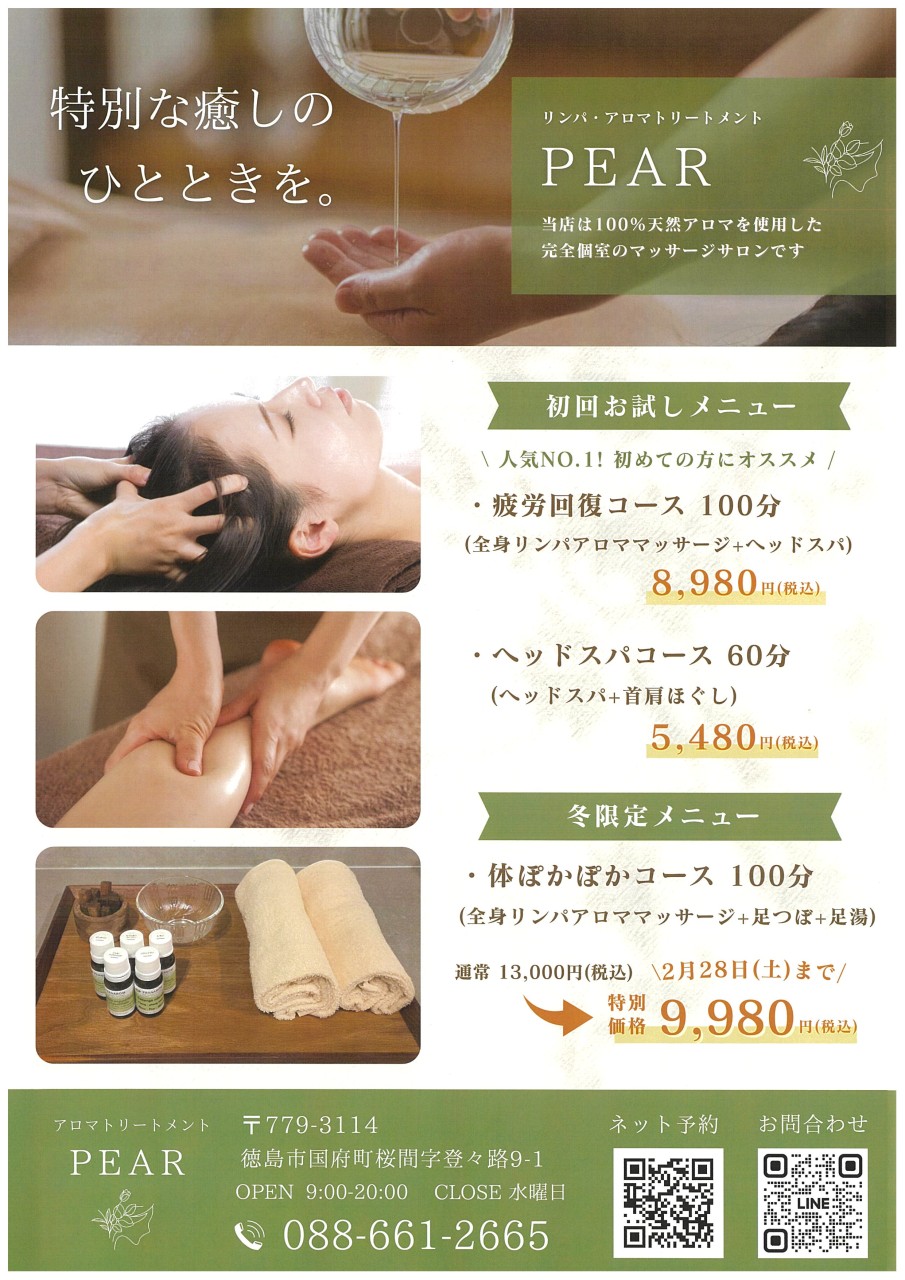 リンパ•アロマトリートメント PEAR(ペア)|100%天然アロマ使用|個室マッサージ