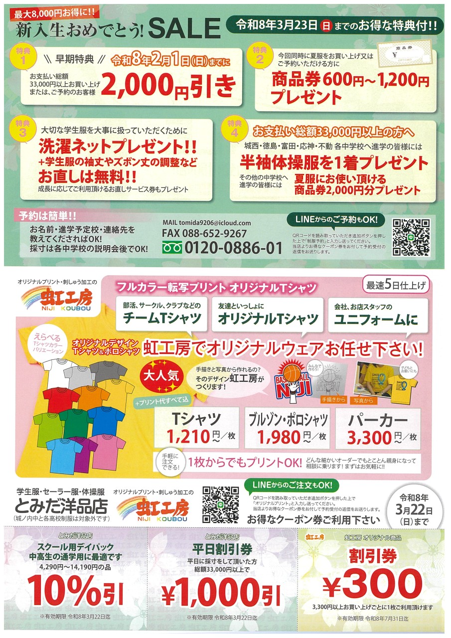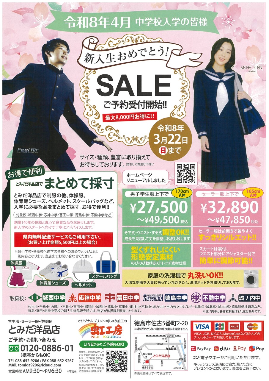 とみだ洋品店|新入生おめでとう!SALE|令和8年4月中学校入学の皆様