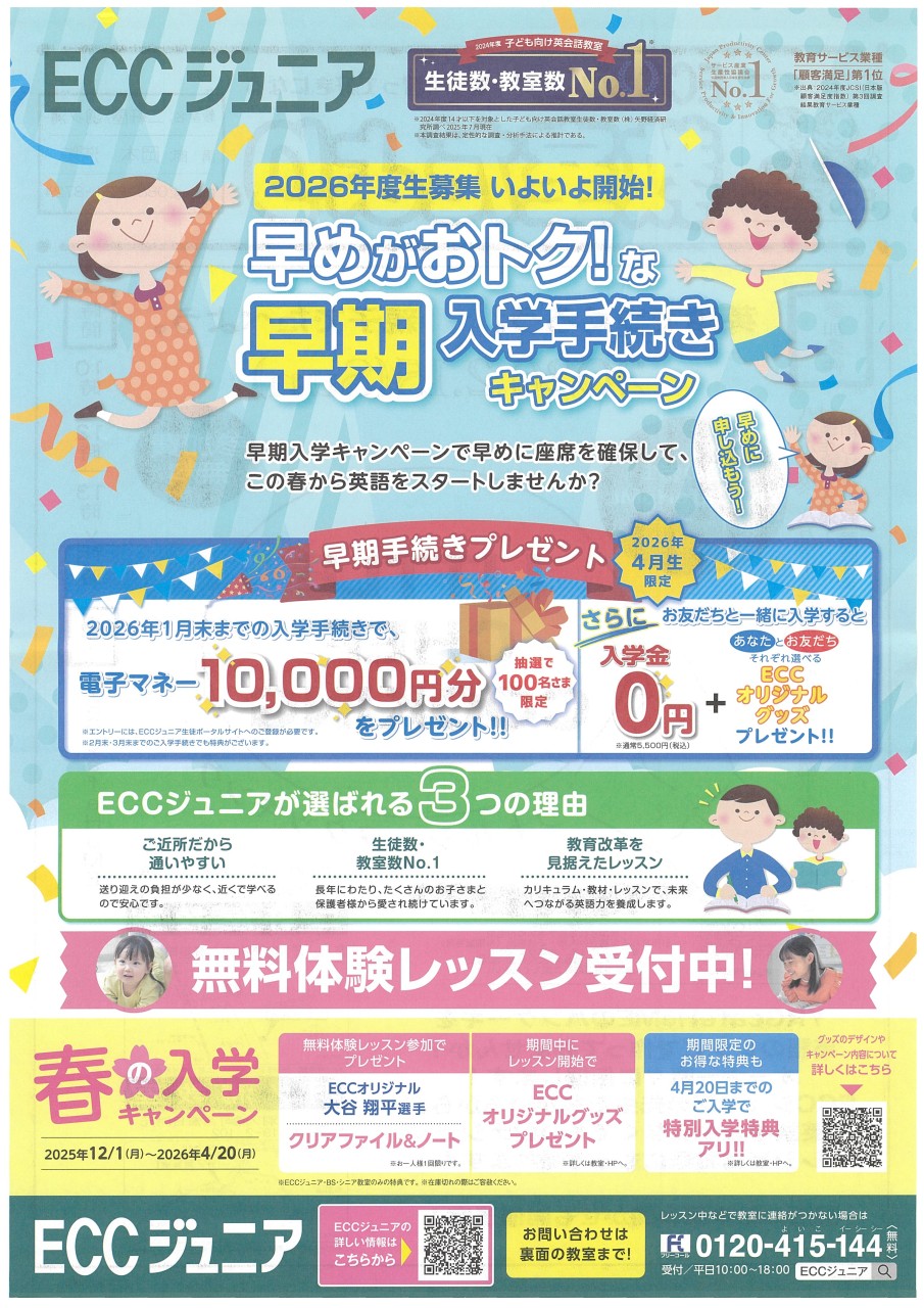 ECCジュニア二軒屋教室|羽ノ浦教室|早期入学手続き・春の入学キャンペーン